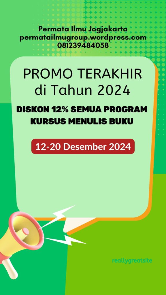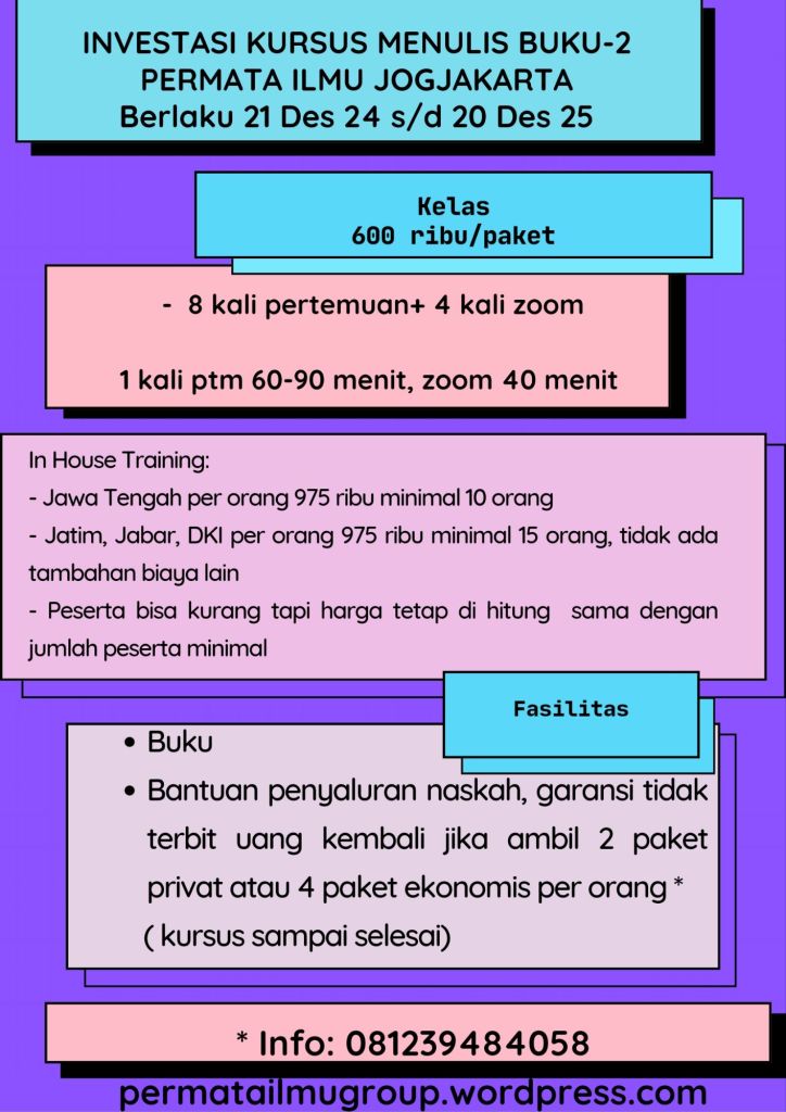 Bonus konsultasi via email tidak kami hilangkan penuh, hanya kami kurangi. Jumlah bonus tersebut disesuaikan cara pembayaran anda, jika anda membayar lunas di muka bonus lebih banyak sedang jika di cicil bonus sedikit bahkan ada yang tidak mendapat bonus konsultasi via email. Untuk kursus menulis buku in house training dan kursus menulis buku untuk anak kami tidak melakukan perubahan. Yuk mari, siaa yang ingin bukunya segera terbit jangan ragu, bergabung saja bersama Permata Ilmu Jogjakarta